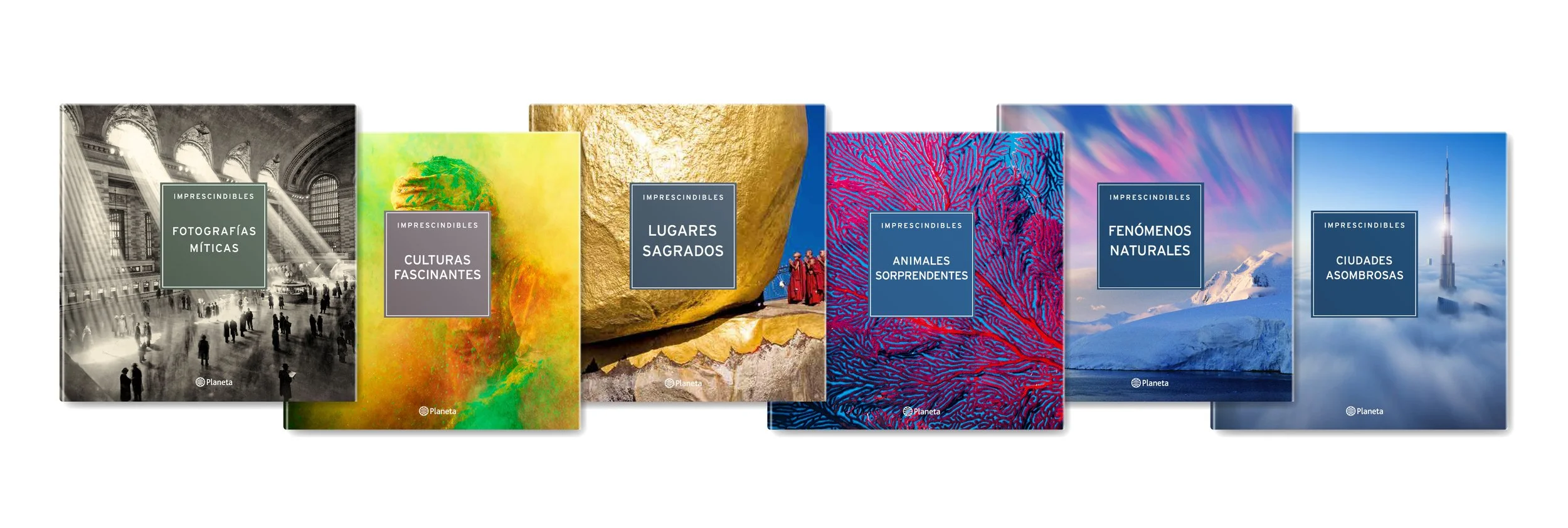 Maquetación de los interiores de los libros de la colección “Imprescindibles” para las obras: Fotografías Míticas, Culturas Fascinantes, Lugares Sagrados, Animales Sorprendentes, Fenómenos Naturales, Ciudades Asombrosas.